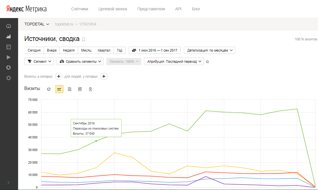 Интернет-магазин «TopDetal.ru» пришел к нам на продвижение в октябре 2016 года. В конце сентября посещаемость ресурса составляла 37 000 переходов в месяц.