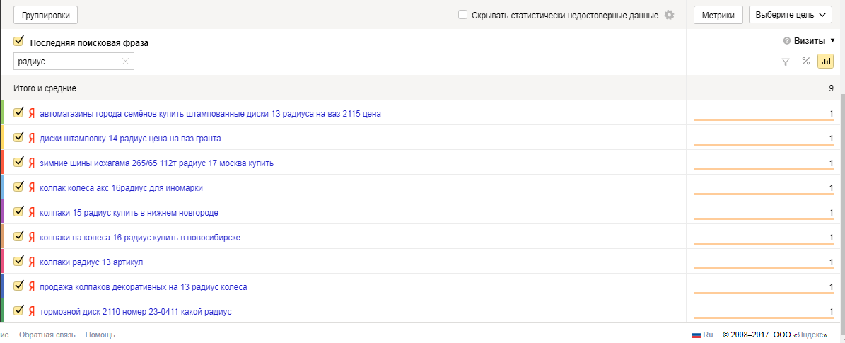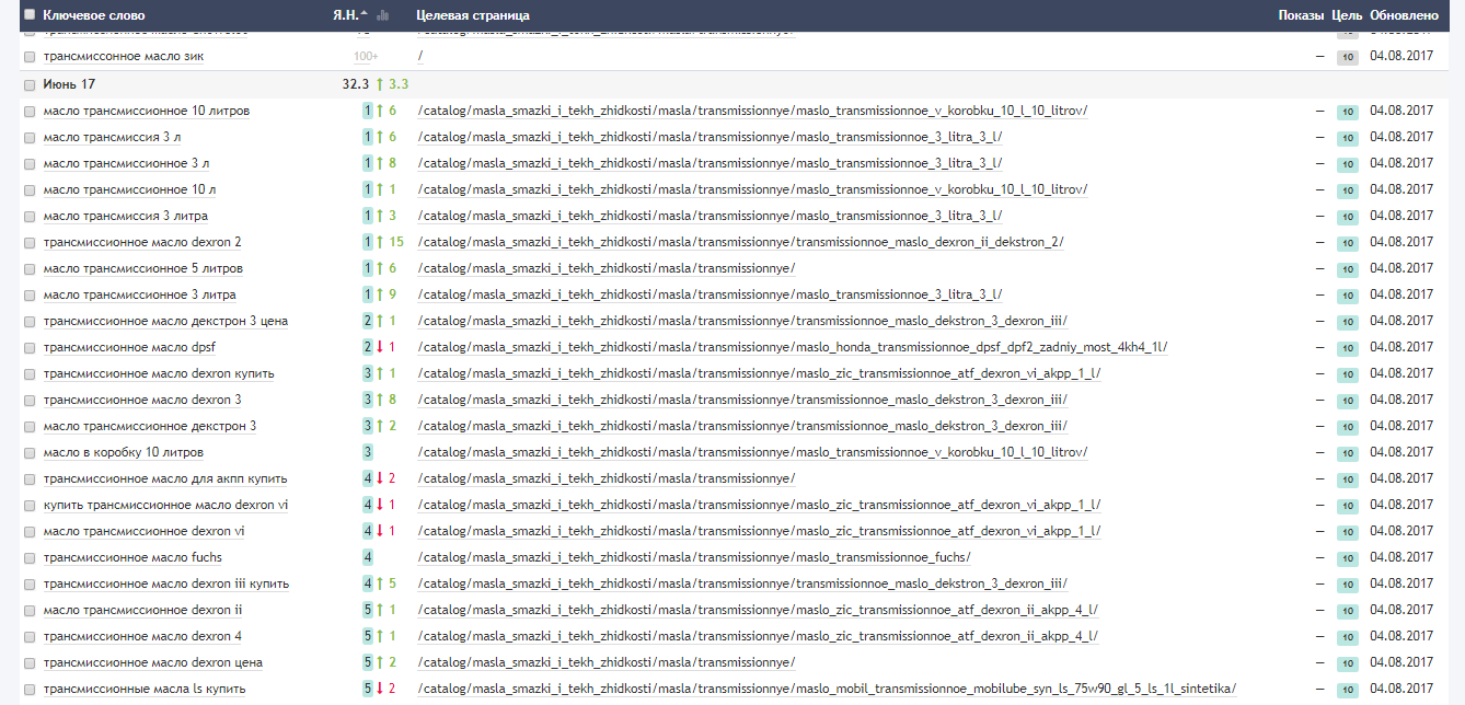 Статистика по ключевым запросам, использованным в июне (позиции сняты в августе 2017 г.)