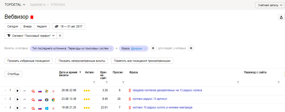 Обратите внимание на глубину просмотра и время на сайте: по каждому НЧ запросу переходов немного, но они качественные, с высоким шансом монетизации лида. Поскольку это низкочастотники, мы стараемся собрать их по максимуму.